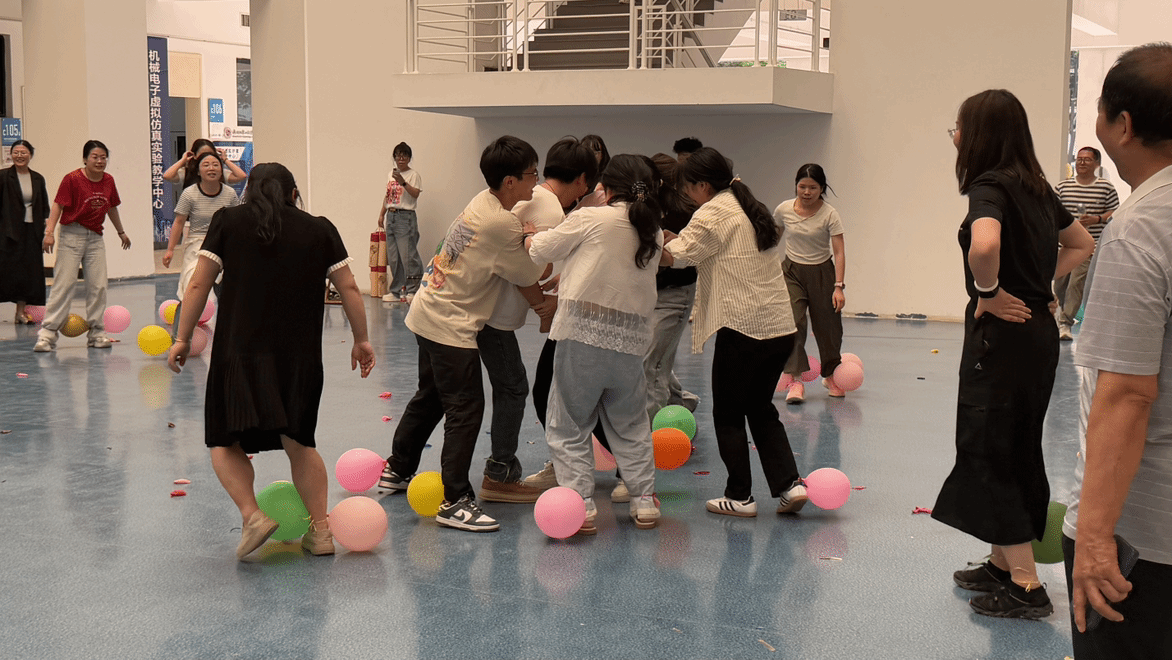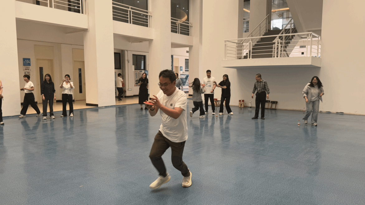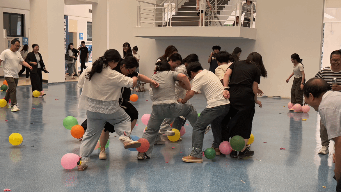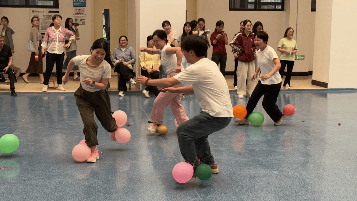 在仙人指路游戏环节,各系老师们两两一组,一人蒙上双眼,依靠同伴的指令穿越重重障碍后到达终点。现场指令声、欢笑声此起彼伏,考验着同事间的默契。托球跑游戏中,各队教职工们手持乒乓球拍,托着乒乓球奋力向前冲刺,力求速度与稳定兼得,气氛紧张而又刺激。丢沙包项目里,大家身手敏捷,灵活躲避攻击、奋力投掷,现场气氛热烈非凡。最后的踩气球环节将本次运动会推向高潮,教职工们既要保护自己脚上的气球不被他人踩破,又要想办法踩破他人的气球,你来我往,热闹异常。