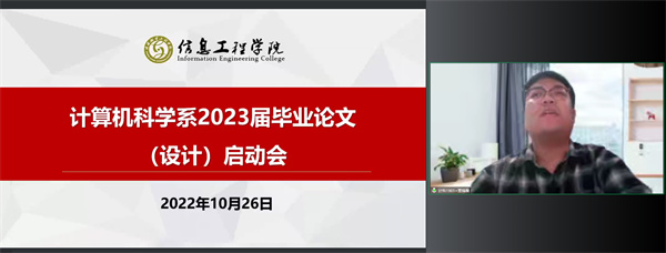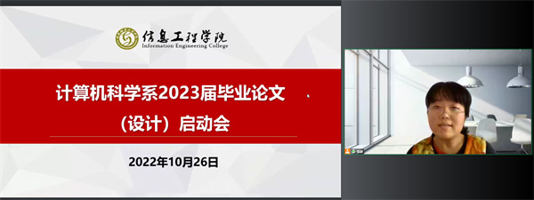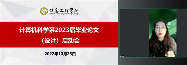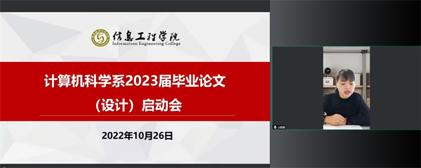 会议第二项由计算机科学系系主任戴静老师介绍毕业论文(设计)的整个流程及具体要求,强调了2023届毕业论文(设计)工作的重要时间节点,对论文指导教师和毕业生提出了相关工作要求,告诫同学们按时保质保量完成毕业论文(设计)。