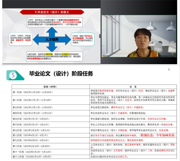 大会第六项由教学副经理党小娟副教授就毕业论文(设计)工作对毕业生及全体指导教师提出具体要求。要求毕业生们首先在思想上要高度重视,必须严格按照导师要求,诚实守信地完成好毕业论文(设计),平衡好毕业论文(设计)与就业之间的关系。其次,行动上要高标准,要刻苦学习、努力钻研、勇于创新。再次,要积极主动地与指导教师进行沟通,定时汇报本人工作进度。最后强调,毕业论文(设计)一人一题,毕业生们需独立完成,严禁抄袭;要求指导教师,第一,要严控时间节点,按时完成,避免拖延。第二,要及时、耐心、细心地指导每位员工。第三,认真完成近期的选题、开题工作。 大会最后,戴静老师进行了总结发言,再次强调了毕业论文(设计)的重要性,同时对2023届毕业生即将开展的毕业论文(设计)工作给予了鼓励。