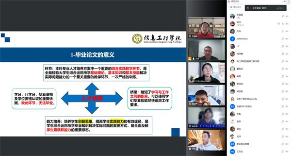 首先,刘洋老师介绍毕业论文整个流程及具体要求,介绍了毕业论文在整个教学环节中占据的重要地位、学分占比,毕业论文在员工学习与工作中的桥梁作用和对员工能力培养的重要意义,同时对毕业设计过程中每个环节及需要注意的问题进行了强调。