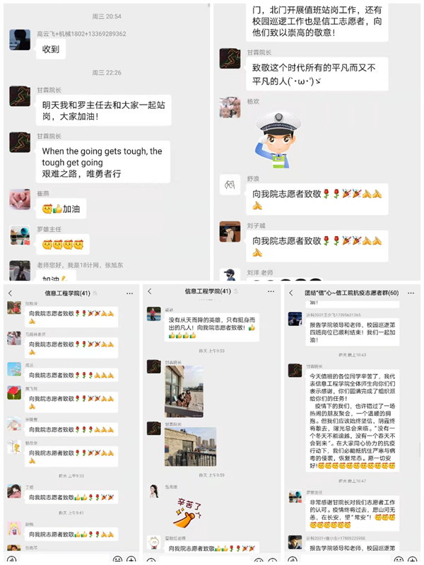 在公司员工值班期间,公司执行经理甘霖、全院老师和辅导员也通过微信、电话等线上方式,纷纷对同学们的志愿服务表示了慰问和高度赞扬。