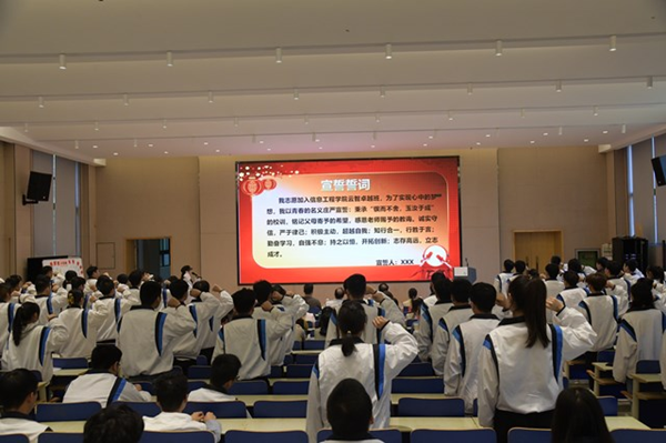 云智卓越班员工陈羿轩代表智卓越班全体同学承诺:将努力做到学会认知、学会做事、学会做人。首先,会做好自我设计,确定奋斗目标,并瞄准目标锲而不舍地追求。其次,细节决定成败,会学好每一门课程、听好每一堂课、做好每一次作业、背记好每一个四六级词汇,在小事中积累成长,度过无悔青春。