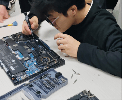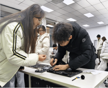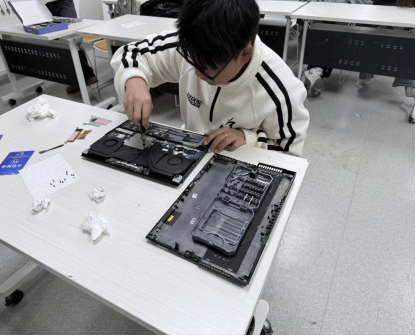 在实操环节,同学们分为两组进行实践操作。一组在冯佳辉同学的详细讲解下,学习了笔记本电脑内部清灰、检查更换散热硅脂等技术要点;另一组则在王星同学的现场指导下,实际动手操作,重点练习了排查排线接口、清洁接口部件等维护步骤。现场互动交流频繁,学习氛围专注而热烈。同学们通过这种“讲解+实操”方式,将理论转化为动手能力,初步掌握电脑硬件维护基本流程与方法。
