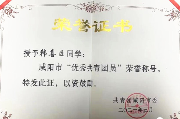 2021年3月,共青团咸阳市委表彰了优秀典型和模范代表,公司辅导员贾永旺老师在本次表彰中荣获“优秀共青团干部”荣誉称号;公司物联网工程2001班的韩喜臣同学荣获“优秀共青团员”荣誉称号。