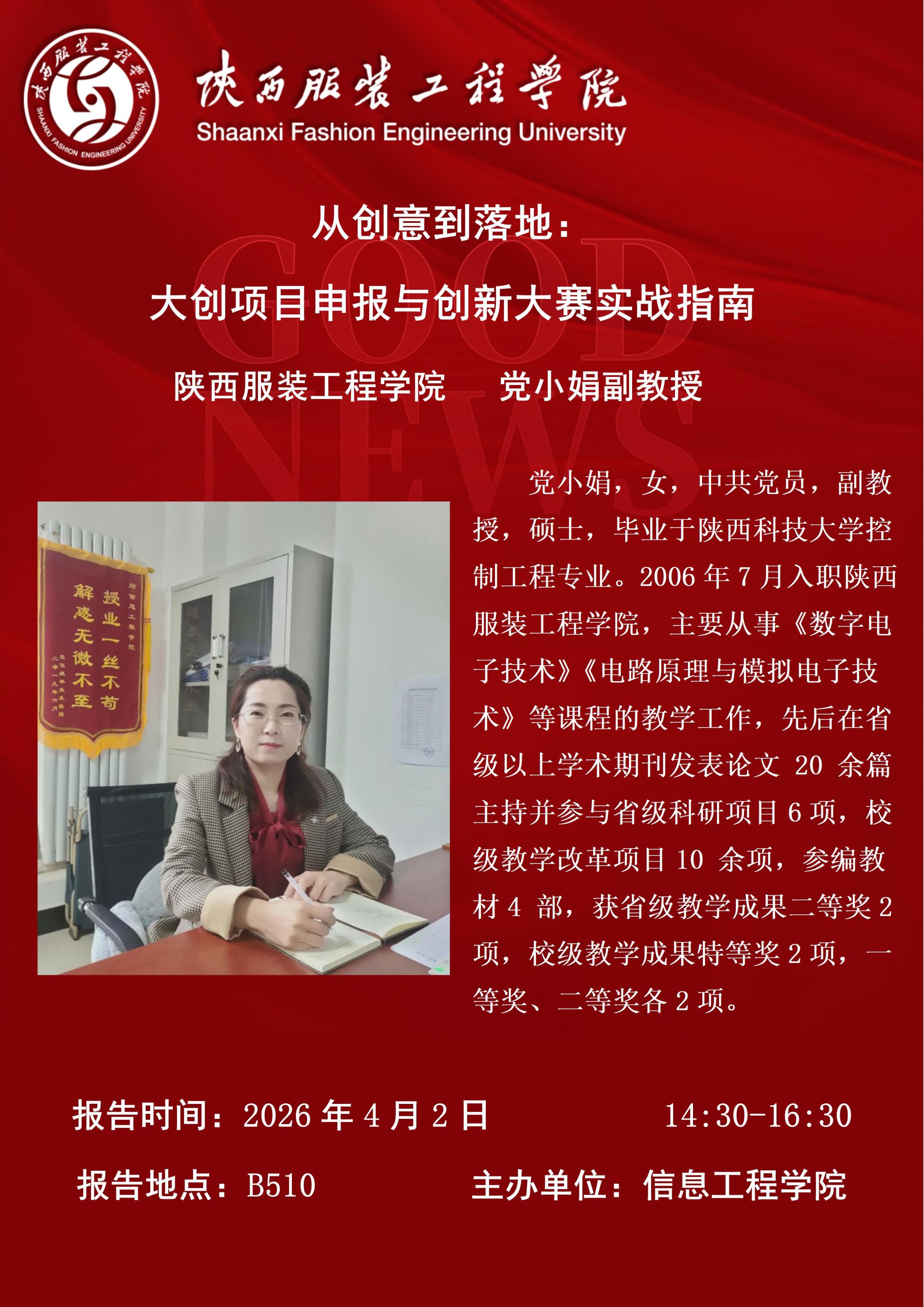 为帮助同学们更好地完成大创项目申报、备战创新大赛,公司将举办“从创意到落地:大创项目申报与创新大赛实战指南”专题讲座。讲座将围绕选题思路、申报书撰写、项目打磨及竞赛实战技巧展开讲解,助力大家将创意转化为优质项目。欢迎有意向参赛及申报大创项目的同学积极参加.时间:4月2日 14:30 ,地点:B510教室。