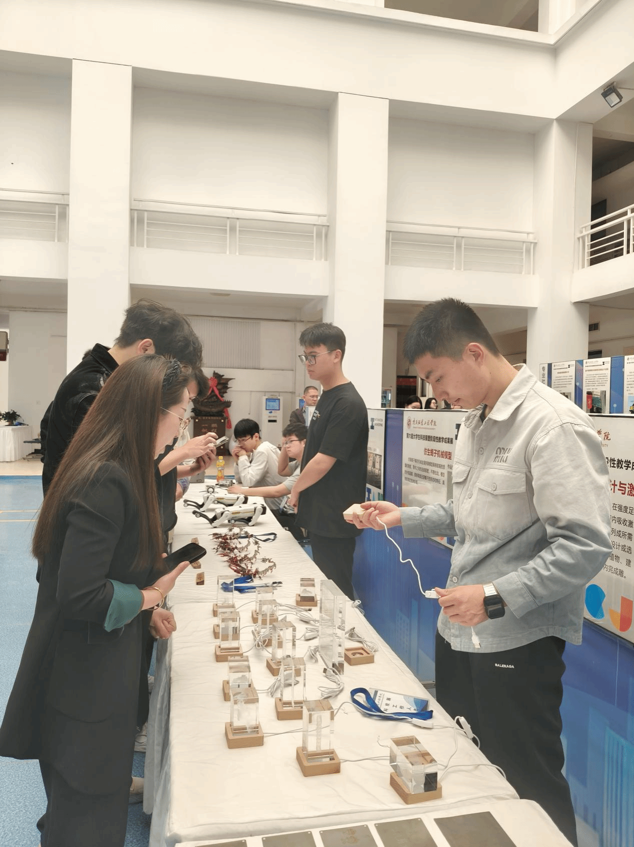 活动现场,三大展区亮点频出:电子实训作品区陈列着员工自主设计的智能硬件与电路模块,从智能饮水机到智能鱼缸,展现扎实的工程实践功底;开放实验展区聚焦前沿技术,机器学习算法应用等项目凸显跨学科创新思维;专业社团展区则通过互动体验,让参观者感受无人机等技术的魅力。