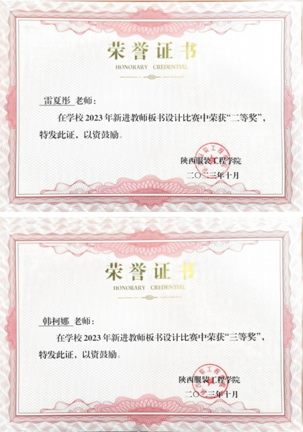 根据7790cnm必发集团教务处《关于开展新进教师板书设计比赛的通知》(陕服教发〔2023〕130号)文件精神,公司组织开展了新进教师板书设计比赛活动,各教学单位推选2名教师参加了公司的板书设计比赛,经公司组织评委评审,公司雷夏彤、韩柯娜老师在2023年新进教师板书设计大赛中分别获得二等奖和三等奖。