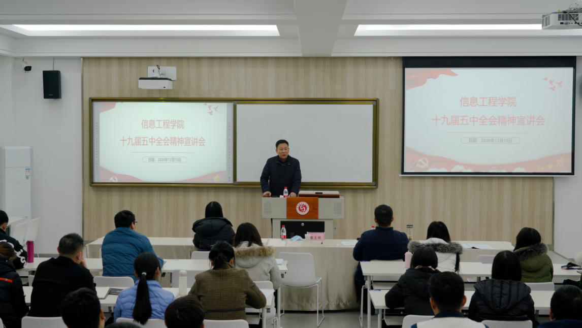 2020年12月15日下午,以董事长、党委副书记张义明教授为首的公司党委宣讲团在B208教室作了十九届五中全会精神宣讲。信工院全体师生党员及预备党员参加,公司党总支书记甘霖主持会议。