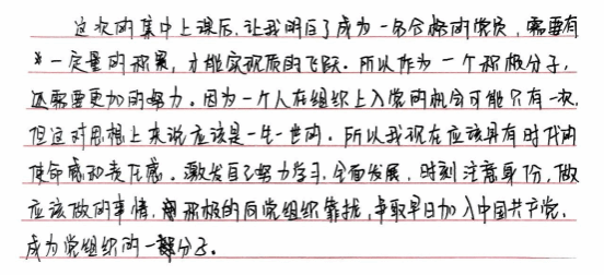 这次的集中上课后,让我明白了成为一名合格的党员,需要有一定量的积累,才能实现质的飞跃。所以作为一个积极分子,还需要更加的努力。因为一个人在组织上入党的机会可能只有一次,但这对思想上来说应该是一生一世的,所以我现在应该具有时代的使命感和责任感,激发自己努力学习,全面发展,时刻注意身份,做应该做的事情,积极的向党组织靠拢,争取早日加入中国共产党,成为党组织的一份子。