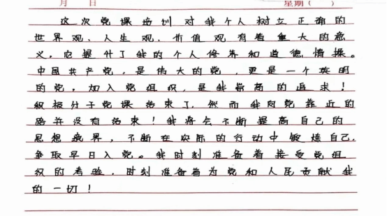 这次党课培训对我个人树立正确的世界观、人生观,价值观有着重大的意义,它提升了我的个人修养和道德情操。中国共产党,是伟大的党,更是一个英明的党,加入党组织,是我崇高的追求!积极分子党课结束了,然而我向党靠近的路并没有结束!我将会不断提高自己的思想境界,不断在实际的行动中锻炼自己,争取早日入党。我时刻准备着接受党组织的考验,时刻准备着为党和人民贡献我的一切!