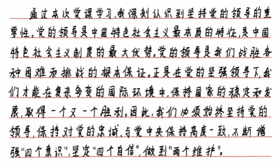 通过本次党课学习,我深刻认识到坚持党的领导的重要性。党的领导是中国特色社会主义最本质的特征,是中国特色社会主义制度的最大优势。党的领导是我们战胜各种困难和挑战的根本保证。正是在党的坚强领导下,我们才能在复杂多变的国际环境中,保持国家的稳定和发展,取得一个又一个胜利.因此,我们必须始终坚持党的领导,保持对党的忠诚、与党中央保持高度一致,不断增强"四个意识",坚定"四个自信",做到"两个维护”。
