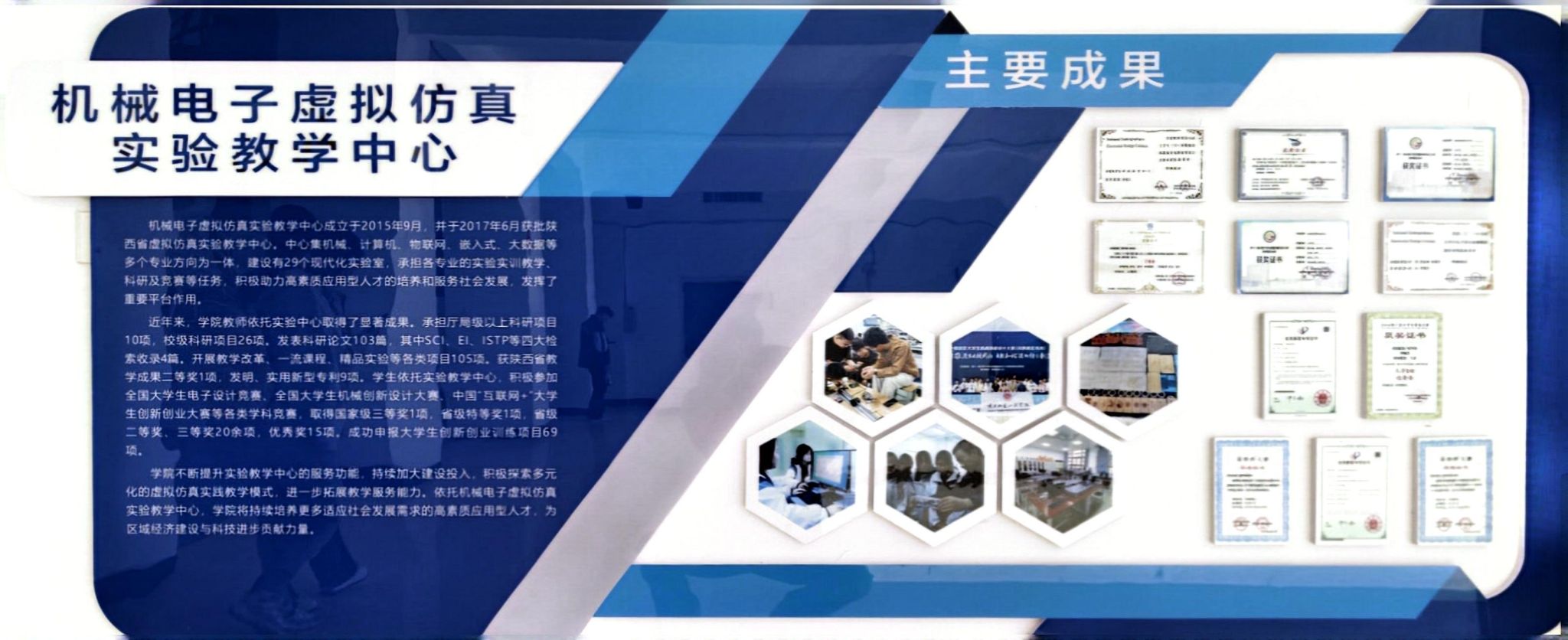 机械电子虚拟仿真实验教学中心成立于2015年9月,并于2017年6月获批陕西省虚拟仿真实验教学中心。中心集机械、计算机、物联网、嵌入式、大数据等多个专业方向为一体,建设有29个现代化实验室,承担各专业的实验实训教学、科研及竞赛等任务。积极助力高素质应用型人才的培养和服务社会发展,发挥了重要平台作用。 近年来,公司教师依托实验中心取得了显著成果。承担厅局级以上科研项目10项,校级科研项目26项。发表科研论文103篇,其中SCI、...